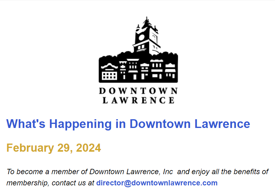 This e-blast highlights an assortment of events and special promotions and activities occurring in Downtown Lawrence. With a mailing list of thousands of recipients and an open rate that averages well over 40%, this is a powerful way to spotlight all that is happening in the district, and also for businesses to get themselves in front of the public. To have an event or special promotion featured, contact director@downtownlawrence.com.